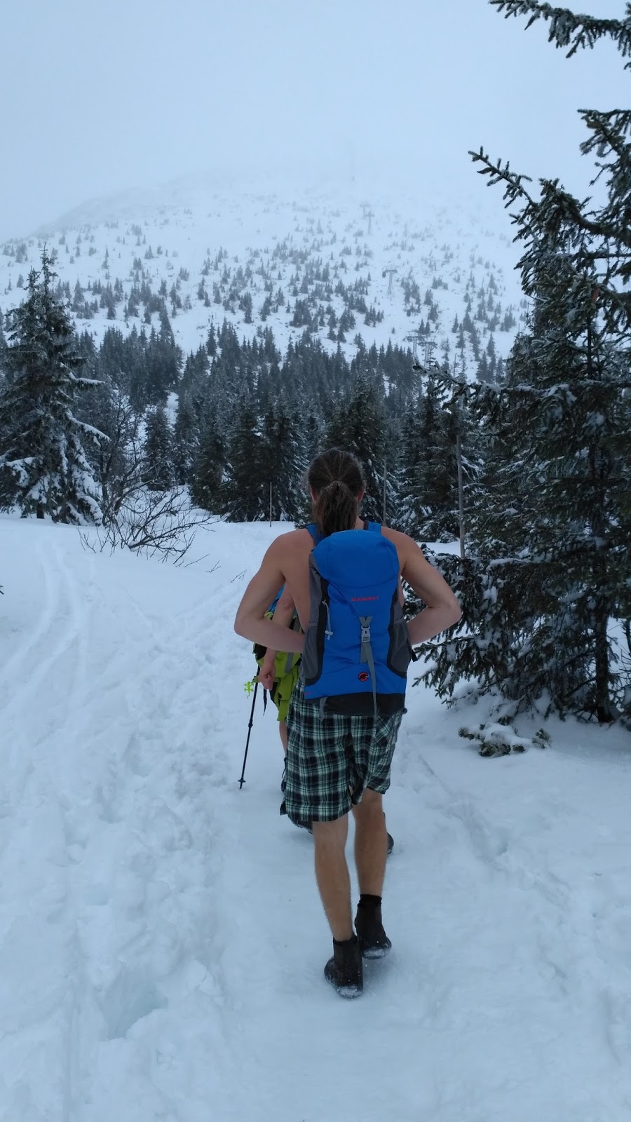 Odchod měl být v devět hodin od Infocentra Turista a opravdu se vyšlo na čas. V 9:05 už jsme mírně stoupali parkovištěm po zelené směrem na Růžovou horu. Původně byla v plánu trasa Obřím dolem, ten byl ale kvůli nebezpečí lavin zavřený. Cesta vedla zpočátku hodně do kopce lesem a to nebyla zima nikomu. Sníh byl ušlapaný a několika lidem se to klouzalo. Mně vůbec a tak jsem půjčil hůlky Lucce z Broumova. A další výhoda holin - nesl jsem v nich mobil. Byl po ruce, věděl jsem o něm, ale nepřekážel mi.